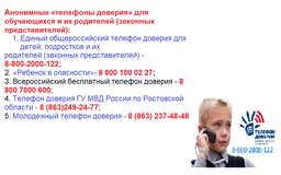 Всероссийский детский телефон доверия 8(800)200-01-22 (звонок из любого региона РФ бесплатный,абонент попадает в службу своего региона,круглосуточно,анонимно)