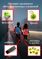 В сумерках или в темноте пешехода на дороге почти не видно. Благодаря световозвращающим элементам пешеходы в условиях плохой или недостаточной видимости обеспечены безопасностью на дороге. Яркое световое пятно,           создаваемое световозвращателем, привлечет внимание водителя и позволит ему вовремя заметить пешехода. Человек, имеющий при себе такой элемент, виден на расстоянии втрое превышающем способность водителя заметить его без           отражателя (130-400м).